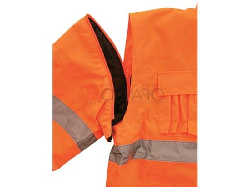 Výstražná zateplená bunda do pása, 2v1, odolná proti vode a vetru, reflexné pruhy, lepené švy, zapínaná na zips krytý légou, odopínacie rukávy s regulovateľnými manžetami, kapucňa v golieri, fleecový vnútorný golier, na dĺžke pružný pás, na ľavý zips, 2 spodné vrecká, dve náprsné vrecká kryté pätkou na suché zipsy, na pravej strane našité malé vrecko na mobil a 3 tunely na ceruzky, na ľavej strane pútko na prichytenie ID karty, jedno vnútorné vrecko. Vnútri je zips pre jednoduchú aplikáciu výšivky na vonkajšiu stranu bundy.