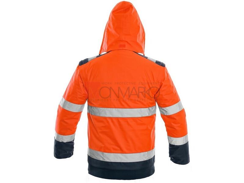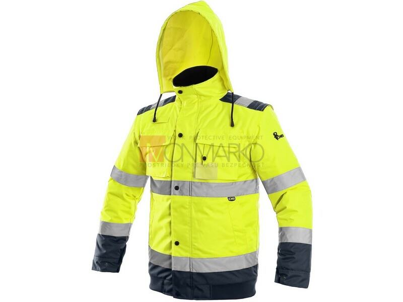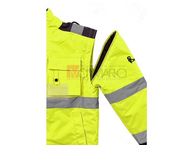• Pánska výstražná zateplená bunda do pása, 2 v 1, odolná proti vode a vetru, reflexné pruhy, lepené švy, zapínaná na zips krytý legou, odopínacie rukávy s regulovateľnými a vnútornými manžetami, kapucňa v golieri, fleecový vnútorný golier, v dĺžke pružný 2 spodné vrecká, dve náprsné vrecká kryté pätkou na suché zipsy, na ľavej strane pútko na prichytenie ID karty, na pravej strane slučka na rádiostanici, jedno vnútorné vrecko. Vnútri je zips pre jednoduchú aplikáciu výšivky na vonkajšej strane bundy. Odporúčané použitie: stavebníctvo, cestári, vodiči, logistika, údržba, smetiari, záchranári, v zime a mokrom prostredí, robotníci.