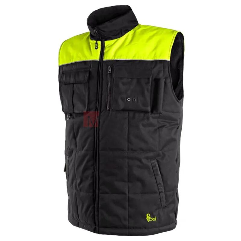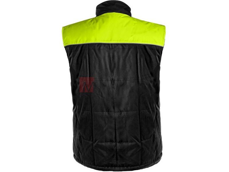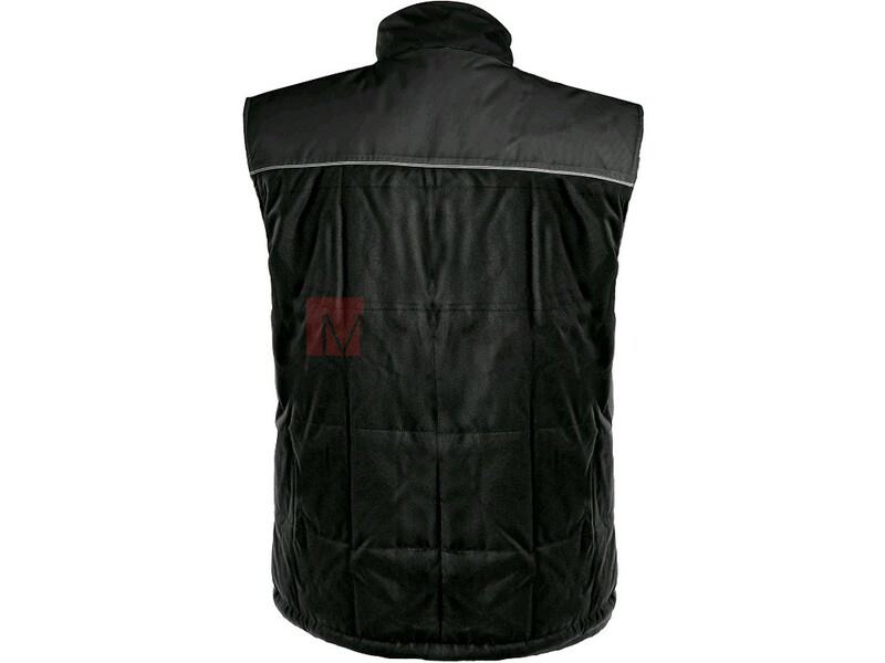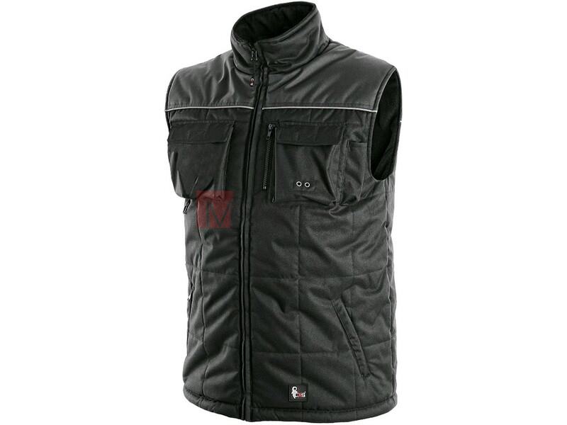 Pánska zateplená vesta, vodeodolná s fleecovým golierom aj podšívkou, reflexné výpustky, zapínanie na zips, sťahovanie v dolnom okraji. Vrecká: dve spodné vrecká zapínané na zips, náprsné vrecká: na pravej strane jedno veľké vrecko zapínané na pätku so suchým zipsom, na ľavej strane jedno vrecko na zips, druhé zatvárané na pätku so suchým zipsom a malým tunelom na ceruzku. Jedno vnútorné vrecko na pravej strane.