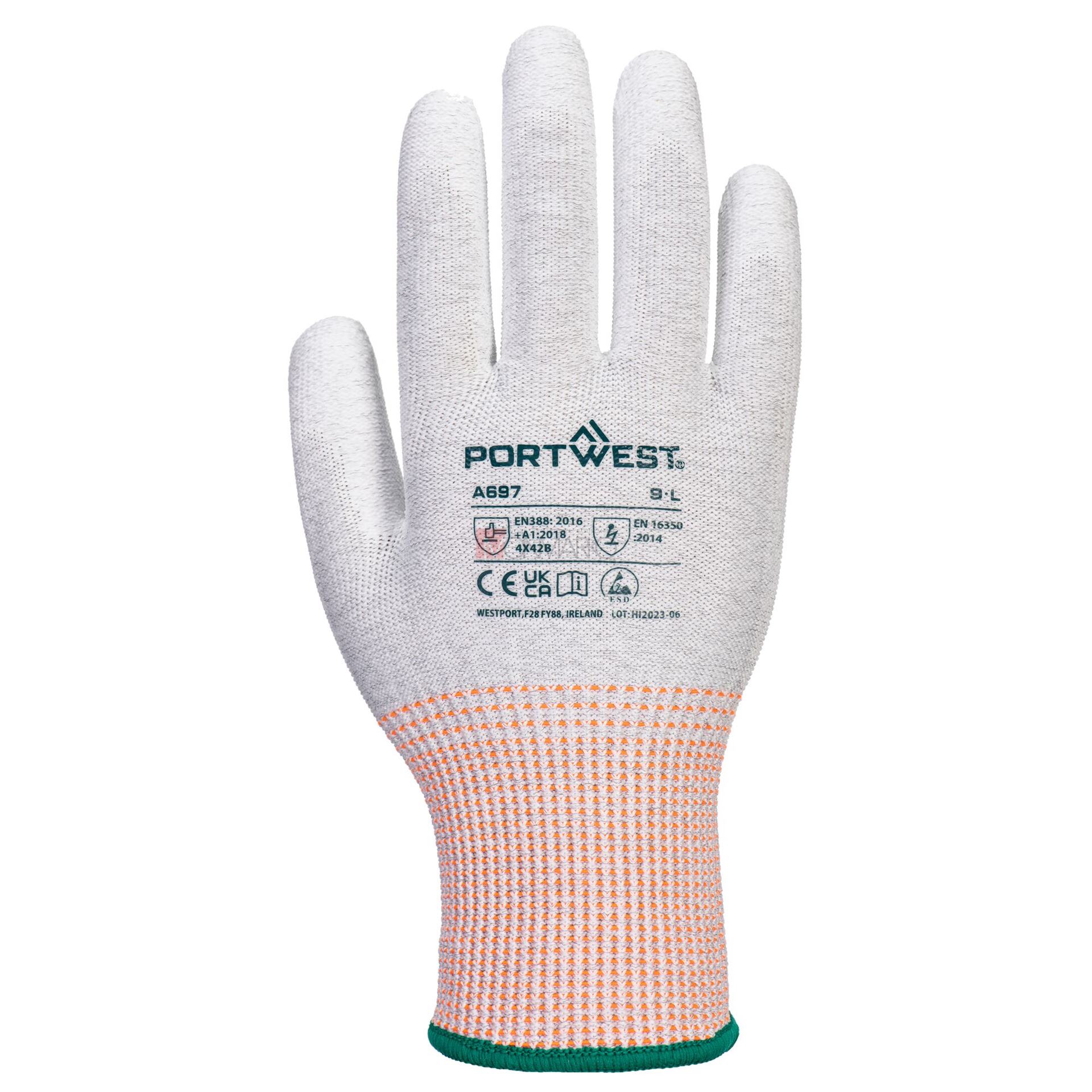 Vlastnosti: Rukavice odolné proti prerezaniu úrovne B na ochranu pred porezaním a ostrými predmetmi. 13g polyester a uhlíkové vlákna, ktoré odvádzajú statickú elektrinu. PU dlaň pre vynikajúcu priľnavosť a obratnosť. Na použitie pri montovaní elektroniky, testovania a pre precíznu prácu. Vhodné na použitie s väčšinou zariadení s dotykovou obrazovkou.