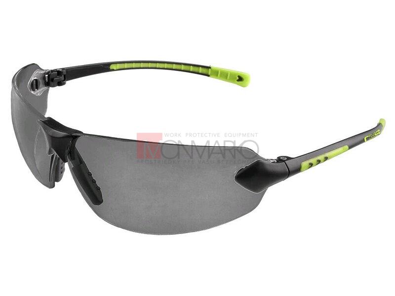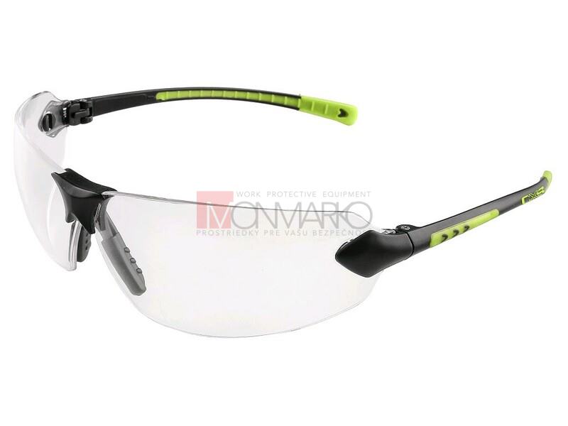 Polykarbonátové okuliare so štíhlymi pružnými bočnicami nespôsobujúce tlak a možnosťou nastavenia uhla zorníka. Vhodné na použitie s prilbou alebo maskou, pri práci v stavebníctve a skladoch. Ochrana UV 400.
