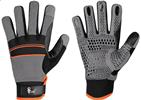 Kombinované rukavice so silikónovými aplikáciami v dlani a prstoch pre lepší úchop a manipuláciu. Dlaň je vyrobená zo syntetickej kože (mikrovlákna), vďaka ktorej sú rukavice pohodlné a odolné voči zrážaniu, naťahovaniu a tvrdnutiu. Oblasť medzi palcom a ukazovákom vystužená PVC. manžeta so suchým zipsom sa ľahko prispôsobí zápästiu.