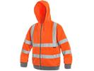 Výstražná mikina s reflexnými pruhmi a kapucňou, zapínanie na zips, hlavicové rukávy, pás a rukávy ukončené pružnou manžetou, dve spodné vrecká.